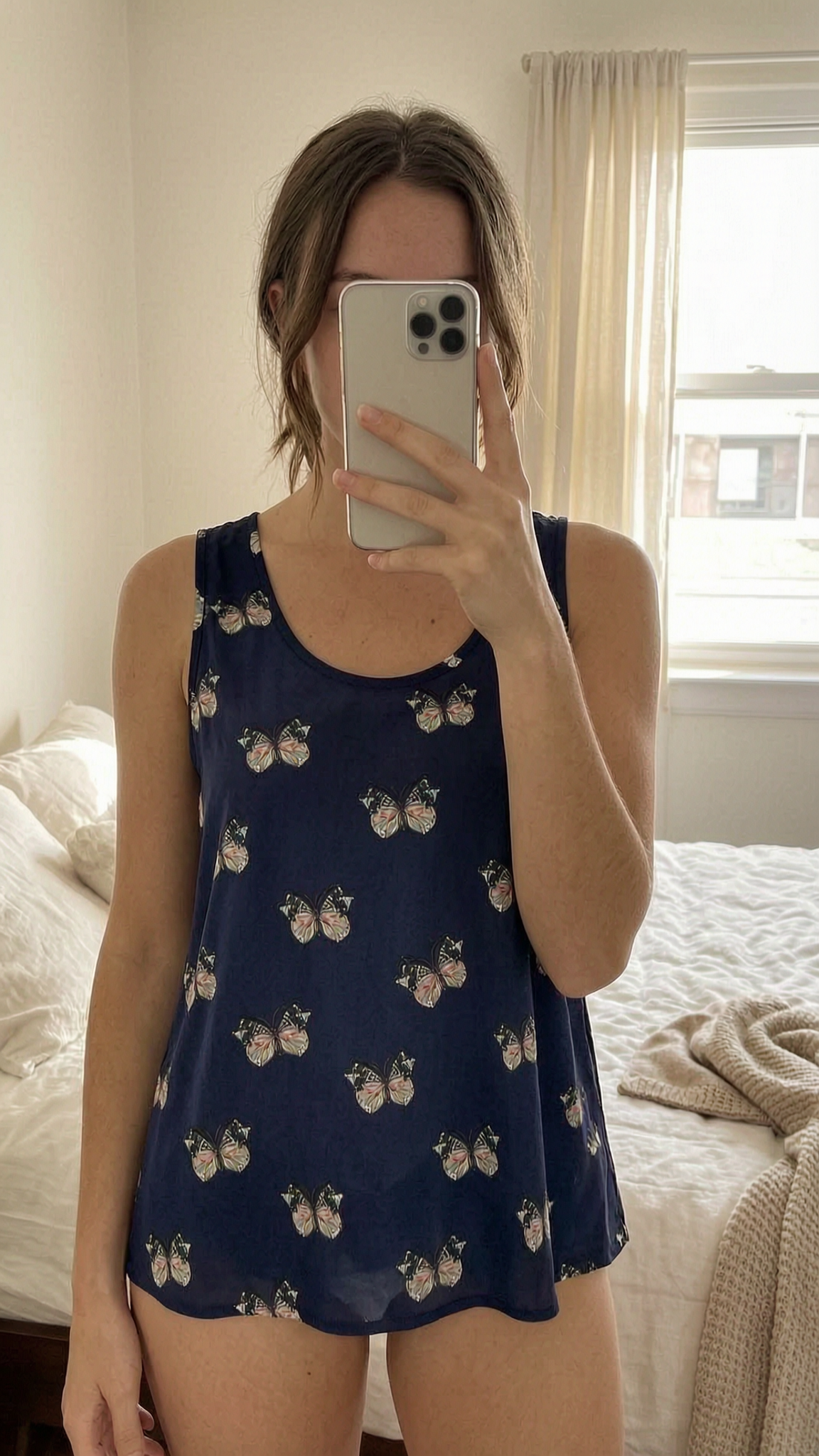A person in Vintage y2K Navy Butterfly Print Top Zip back | Y2K Cute Summer Vest tank standing straight facing the camera, with a slim body type, in a softly lit bedroom setting, with gentle natural light filtering through a window.