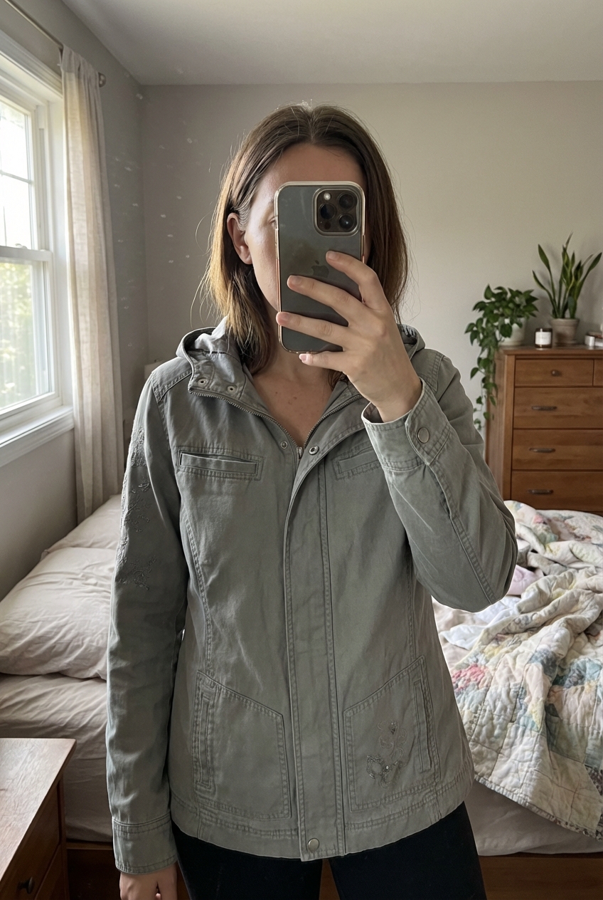 A person in Vintage Y2K next grey satin lined sequin embellished jacket standing straight facing the camera, in a softly lit bedroom setting, with gentle natural light filtering through a window.