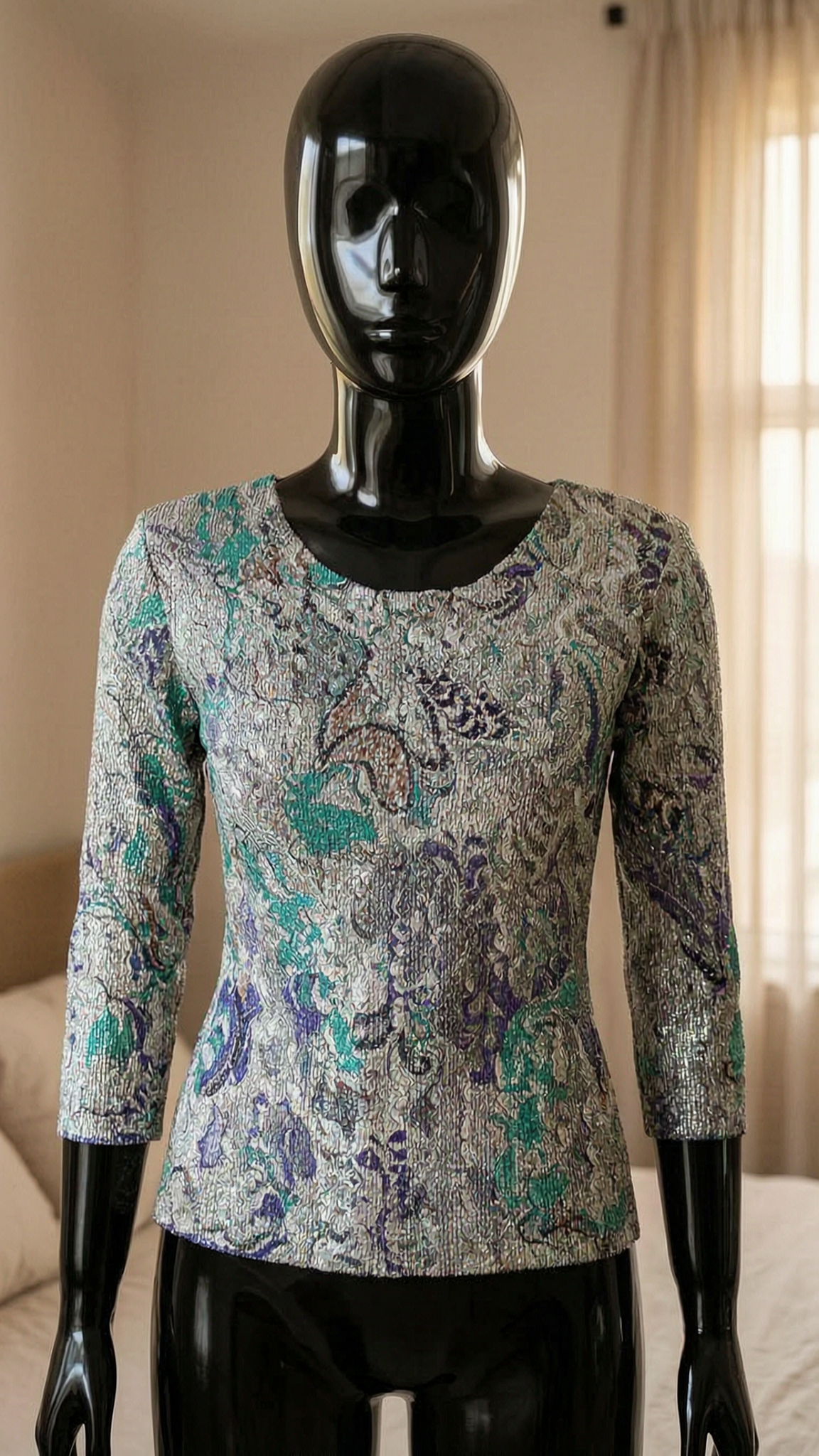 a glossy black plastic mannequin with no facial features in Vintage Y2K Paisley Brocade Long Sleeve Crinkle Top Silver Purple Teal standing straight facing the camera, in a softly lit bedroom setting, with gentle natural light filtering through a window.