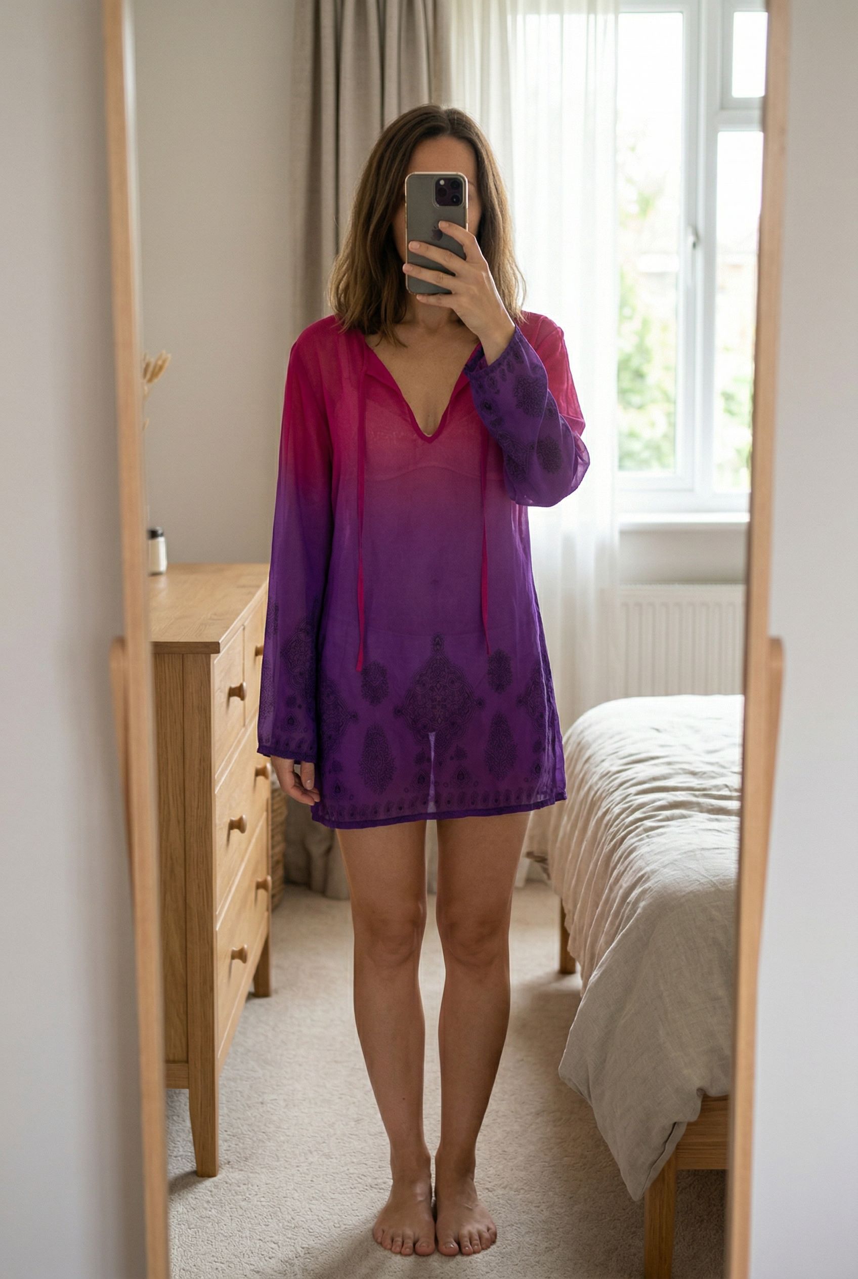 A person in Vintage Y2K pink & purple ombre mesh cover up mini dress standing straight facing the camera, in a softly lit bedroom setting, with gentle natural light filtering through a window.