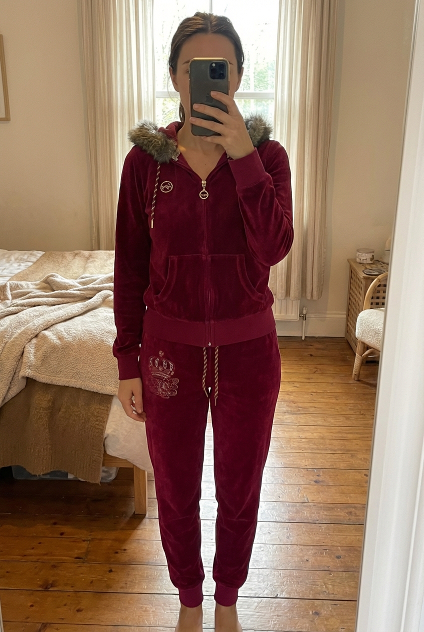 A person in Vintage y2k purple burgundy lipsy tracksuit standing straight facing the camera, in a softly lit bedroom setting, with gentle natural light filtering through a window.