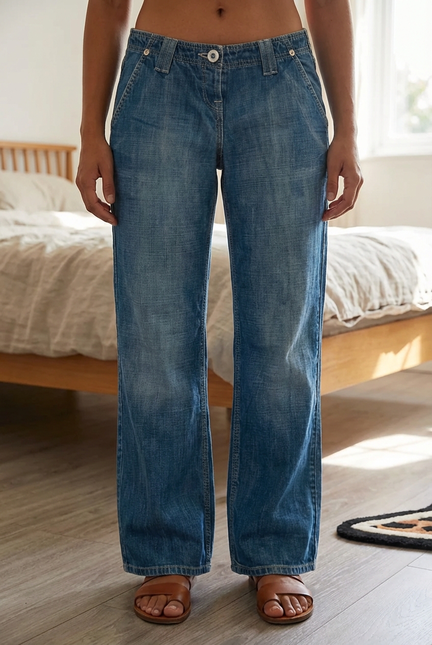 A person in Vintage Y2K river island low waisted straight leg blue jeans standing straight facing the camera, in a softly lit bedroom setting, with gentle natural light filtering through a window.