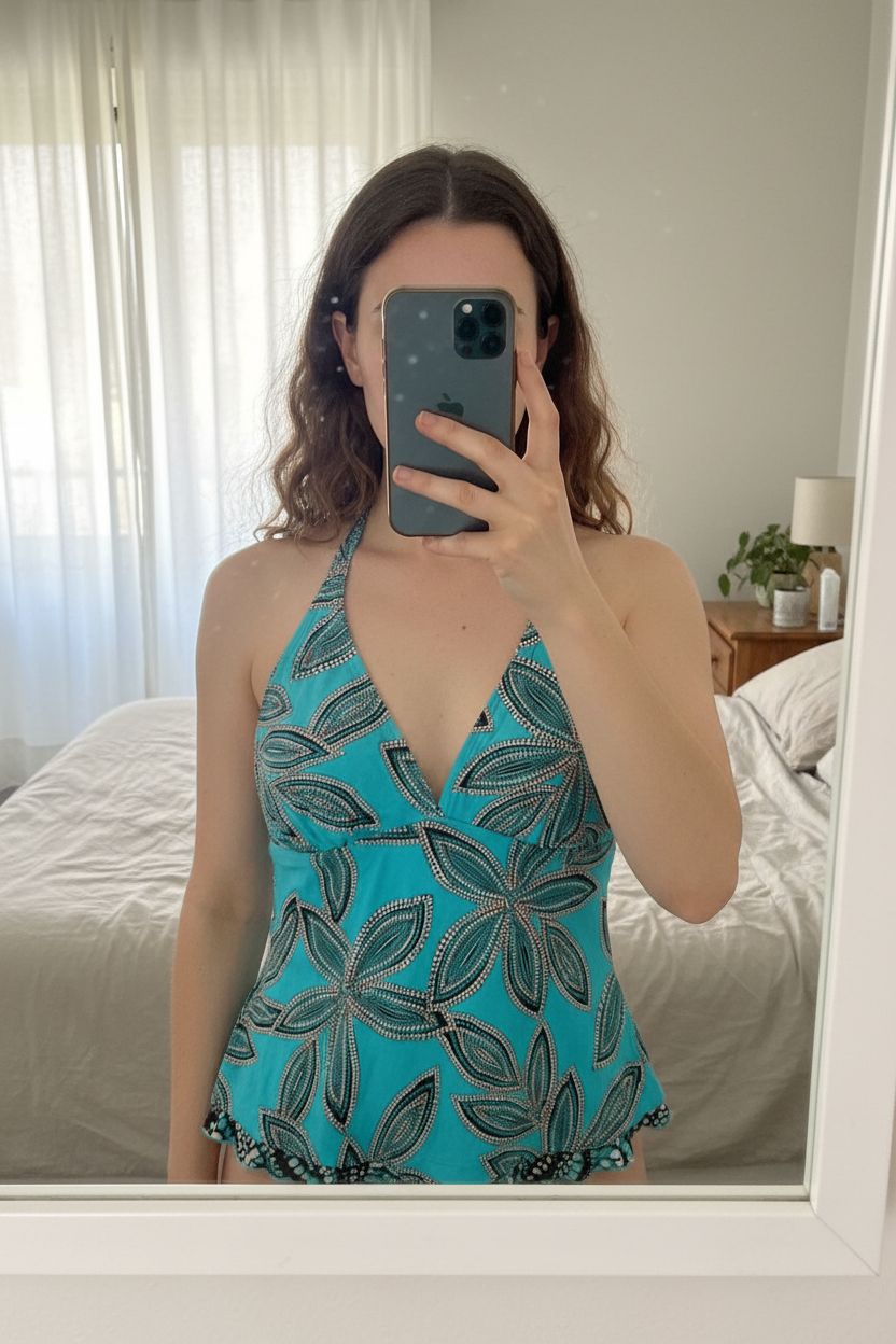 A person in Vintage Y2K turquoise floral print halterneck cami top standing straight facing the camera, in a softly lit bedroom setting, with gentle natural light filtering through a window.