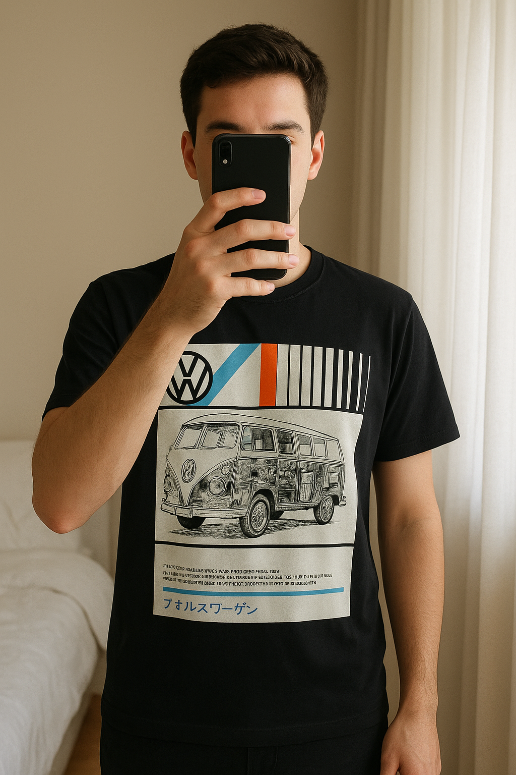 VW Camper Van Graphic T-Shirt – Size Large standing straight facing the camera, in a softly lit bedroom setting, with gentle natural light filtering through a window.
