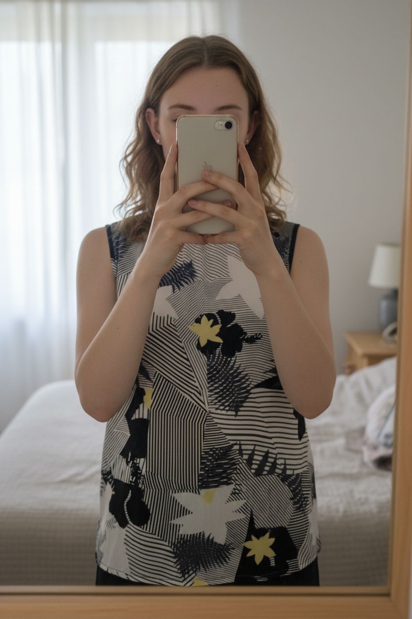 A person in Warehouse Sleeveless Summer Top Side Split Hems Stripes & Leafy Print Size 8 standing straight facing the camera, in a softly lit bedroom setting, with gentle natural light filtering through a window.