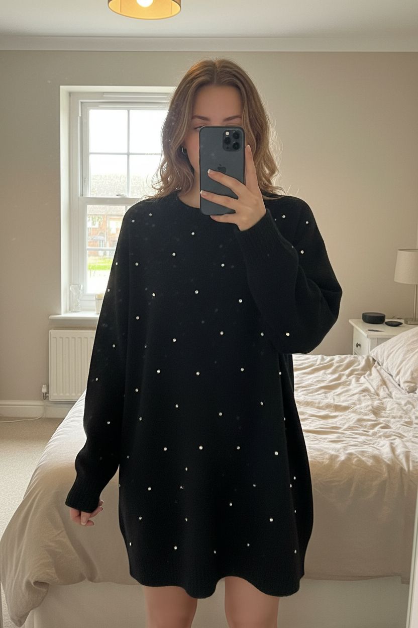 Warehouse Women’s Oversized style Black Jumper Dress with Diamantés Size Medium standing straight facing the camera, in a softly lit bedroom setting, with gentle natural light filtering through a window.