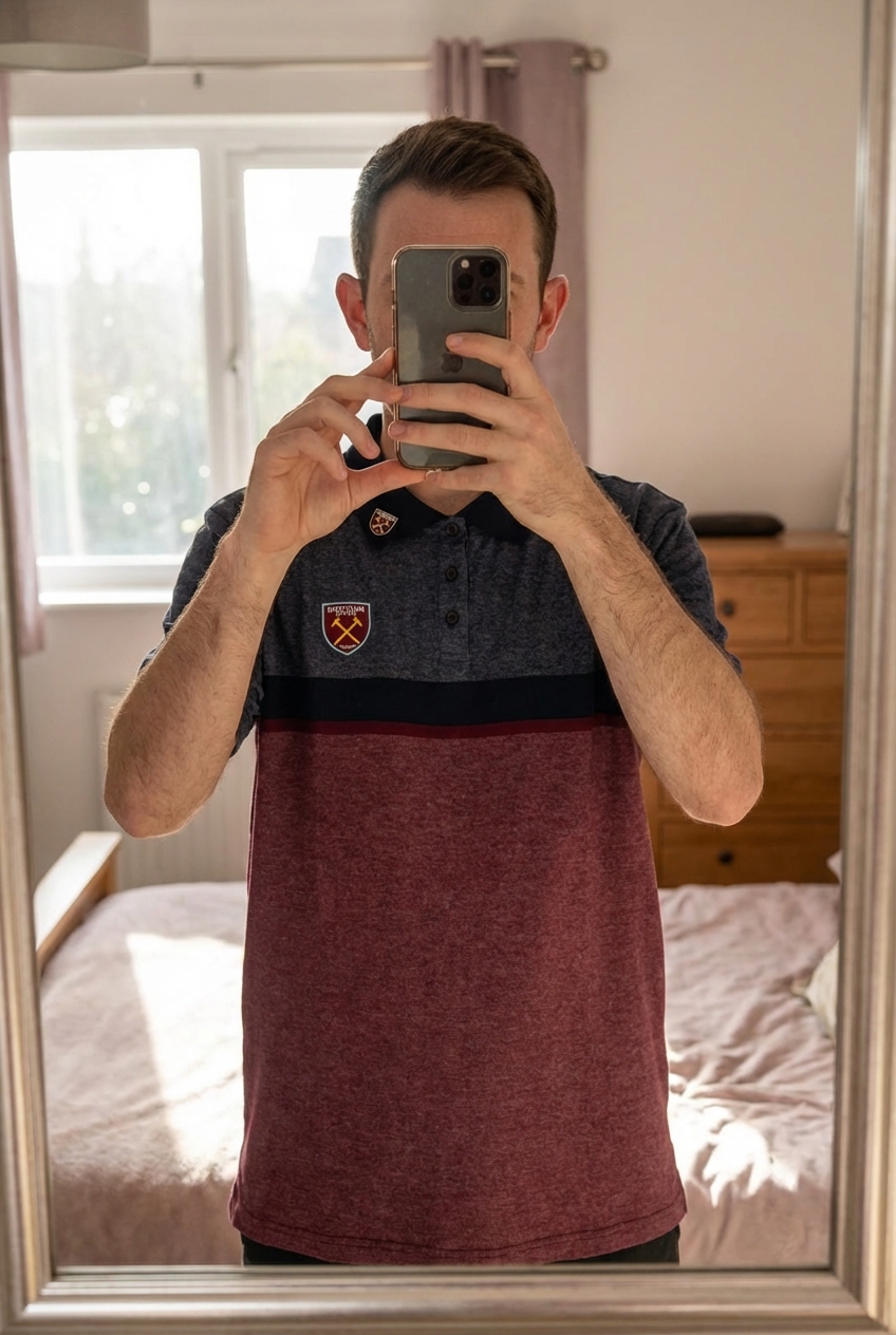 West Ham man’s polo shirt 3XL standing straight facing the camera, in a softly lit bedroom setting, with gentle natural light filtering through a window.