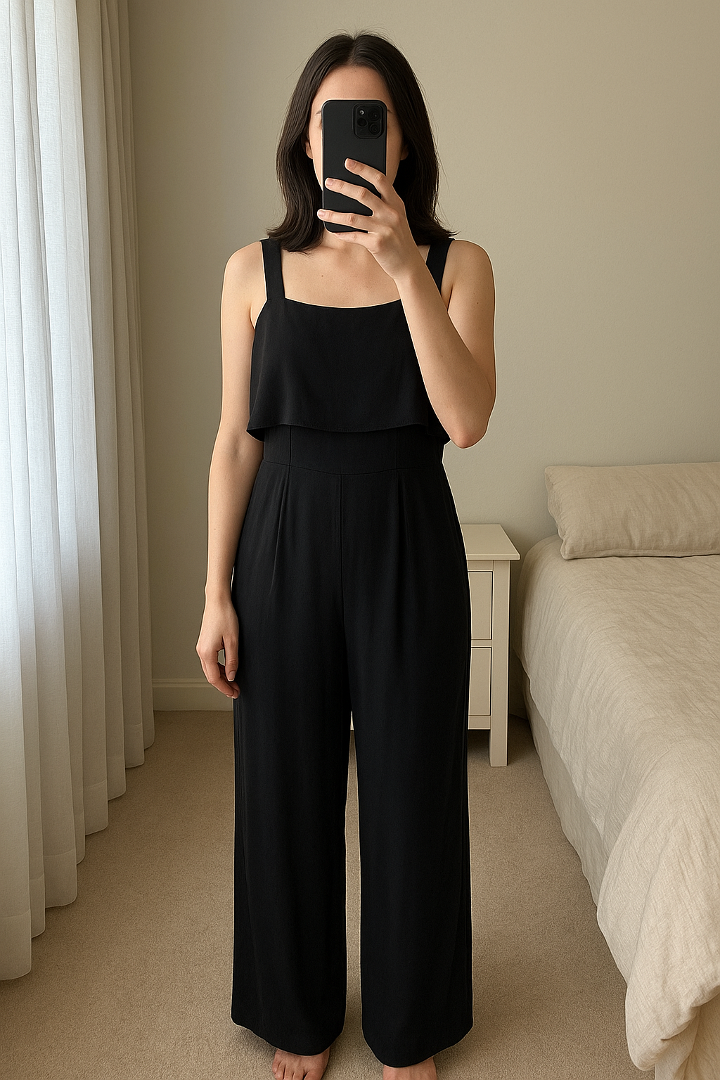 Whistles Women’s Black Jumpsuit standing straight facing the camera, in a softly lit bedroom setting, with gentle natural light filtering through a window.