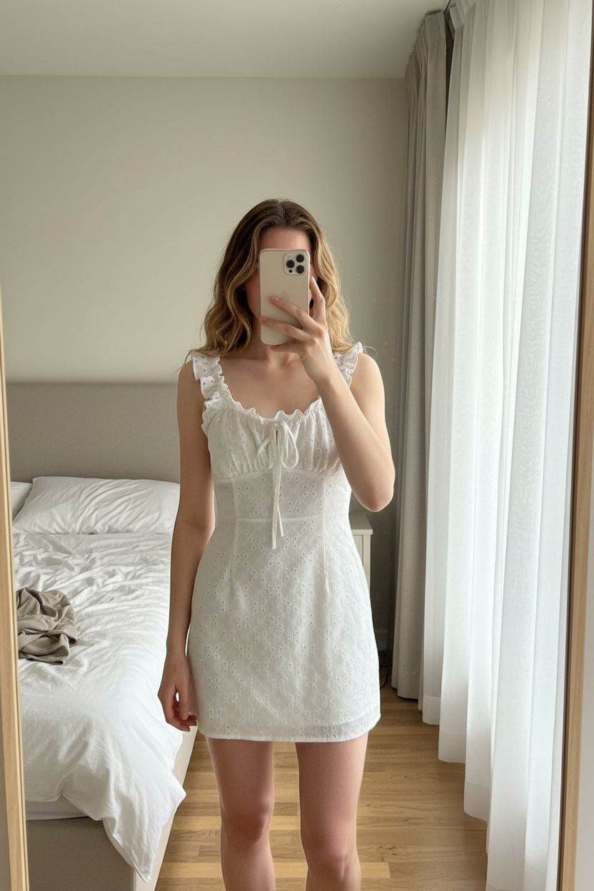 White Broderie Anglaise Mini Dress – Shein – Size XS – New Without Tags standing straight facing the camera, in a softly lit bedroom setting, with gentle natural light filtering through a window.