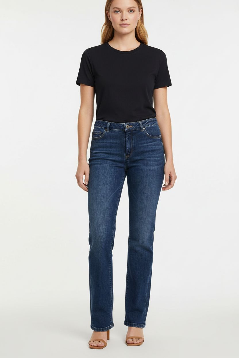 A person in White Company Dark Blue Jeans 12 standing straight facing the camera, in a clean photo studio with seamless white backdrop and softbox lighting.