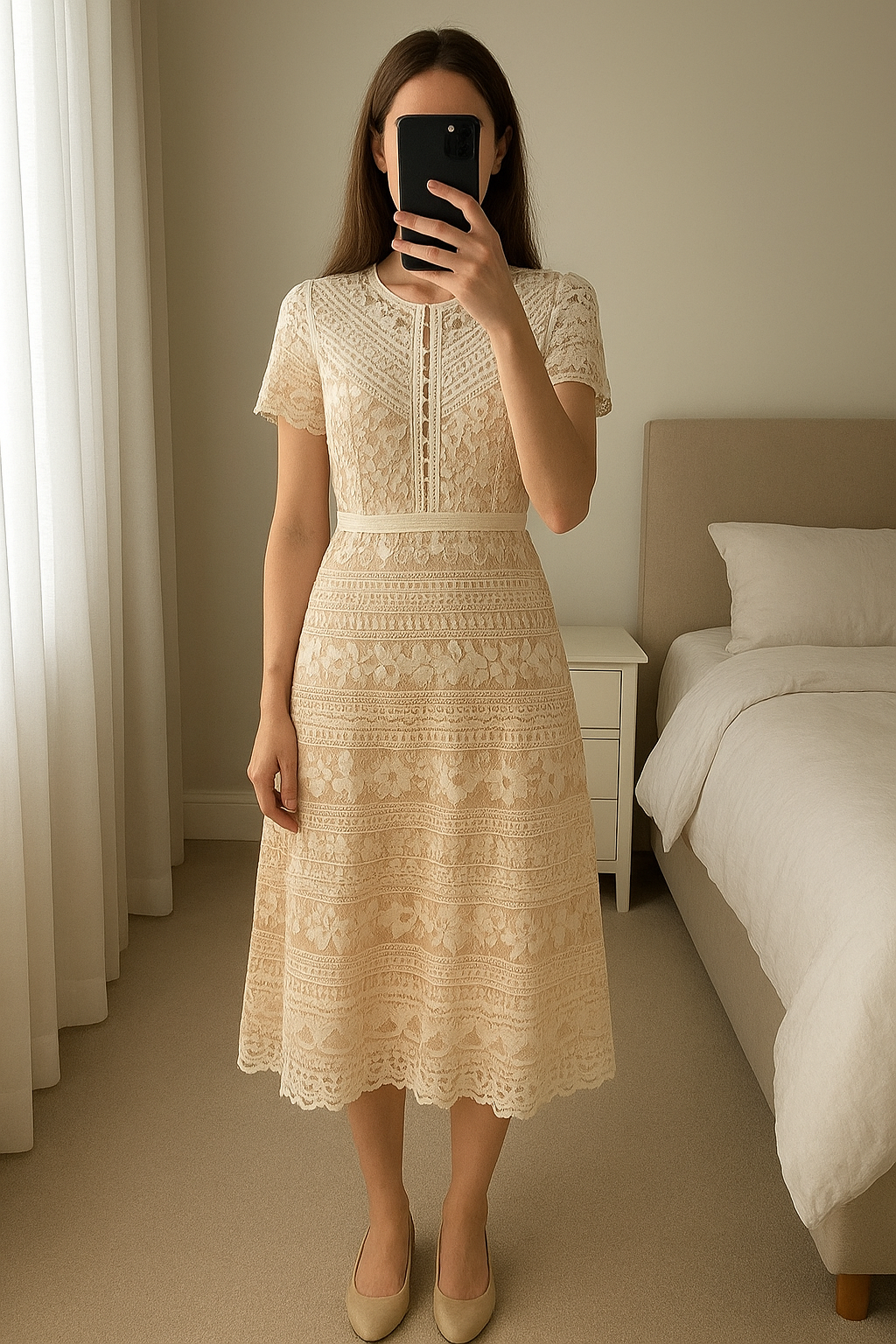 White lace dress standing straight facing the camera, in a softly lit bedroom setting, with gentle natural light filtering through a window.