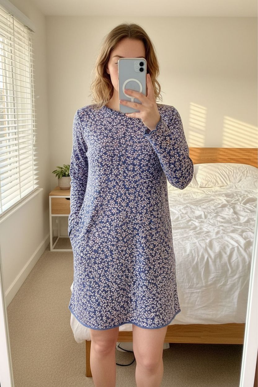 White Stuff Blue Tunic dress UK 10 Long Top Floral Cottagecore Arty Whimsical standing straight facing the camera, in a softly lit bedroom setting, with gentle natural light filtering through a window.