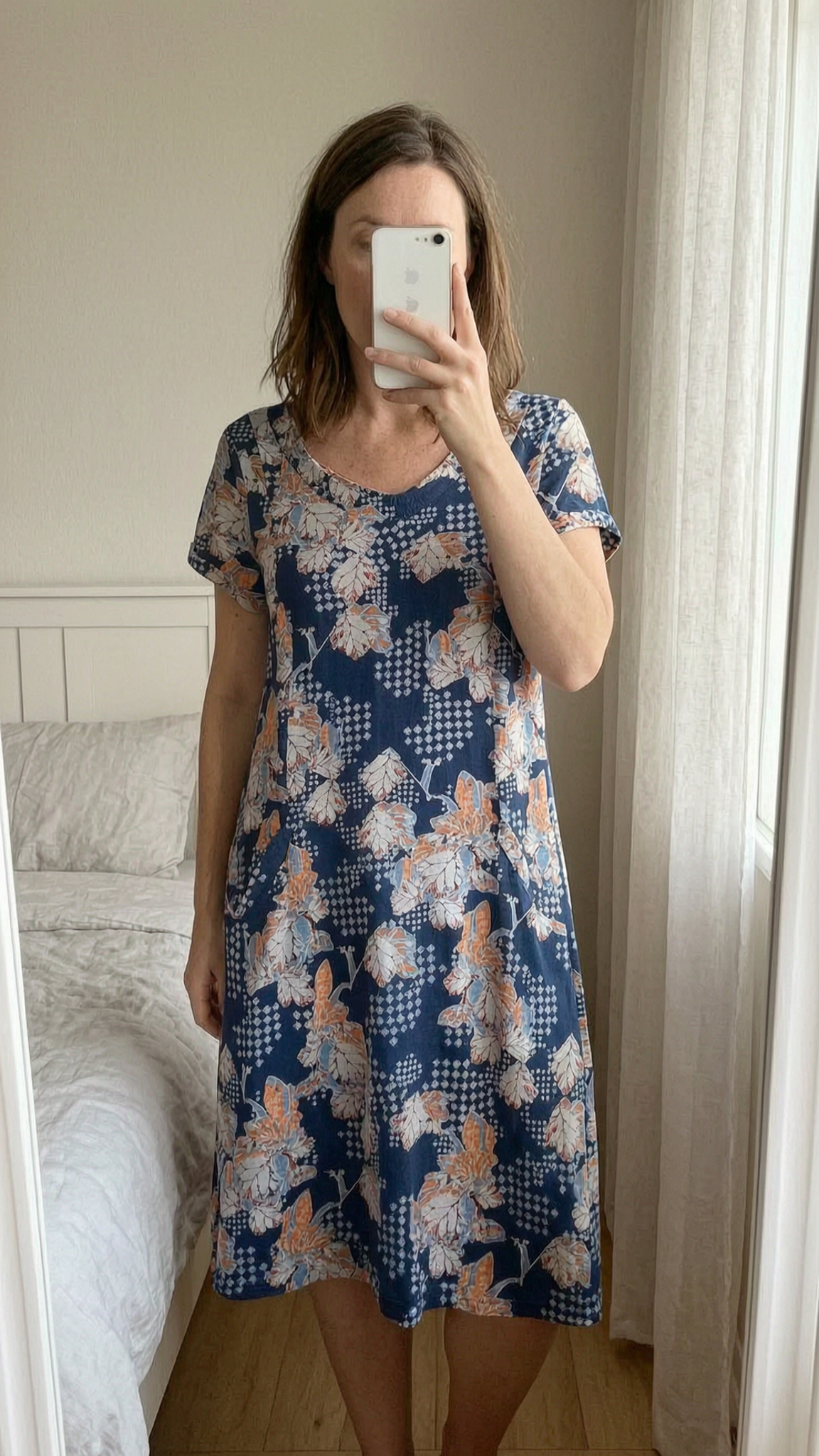 White Stuff Dress - Blue Floral Print - UK 10 standing straight facing the camera, in a softly lit bedroom setting, with gentle natural light filtering through a window.