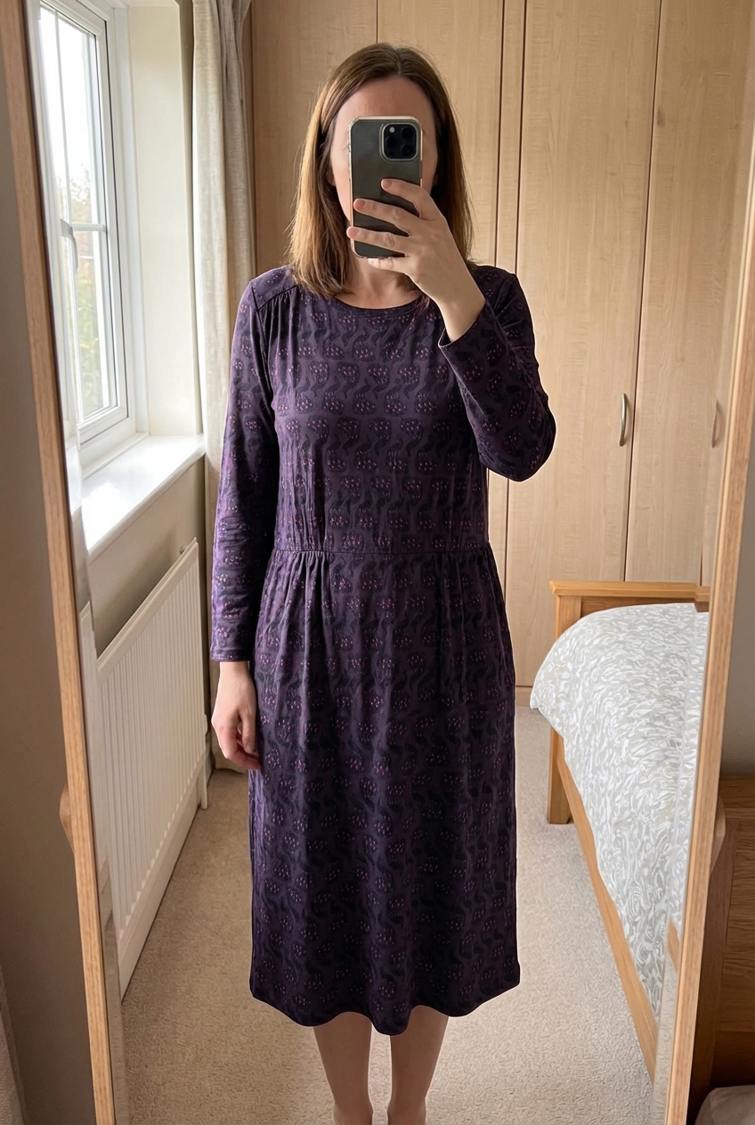 White Stuff midi dress with labels, size 16 standing straight facing the camera, in a softly lit bedroom setting, with gentle natural light filtering through a window.