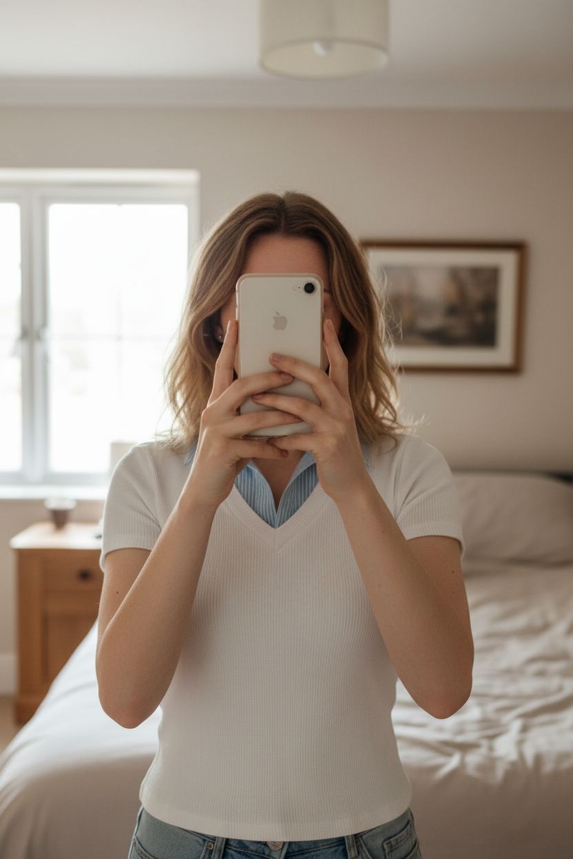 White top standing straight facing the camera, in a softly lit bedroom setting, with gentle natural light filtering through a window.