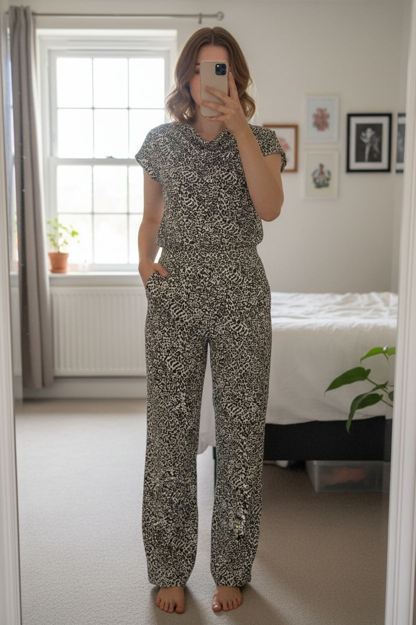 Wild at Heart: Fierce Leopard Print Co-ord Set (Size 10) standing straight facing the camera, in a softly lit bedroom setting, with gentle natural light filtering through a window.