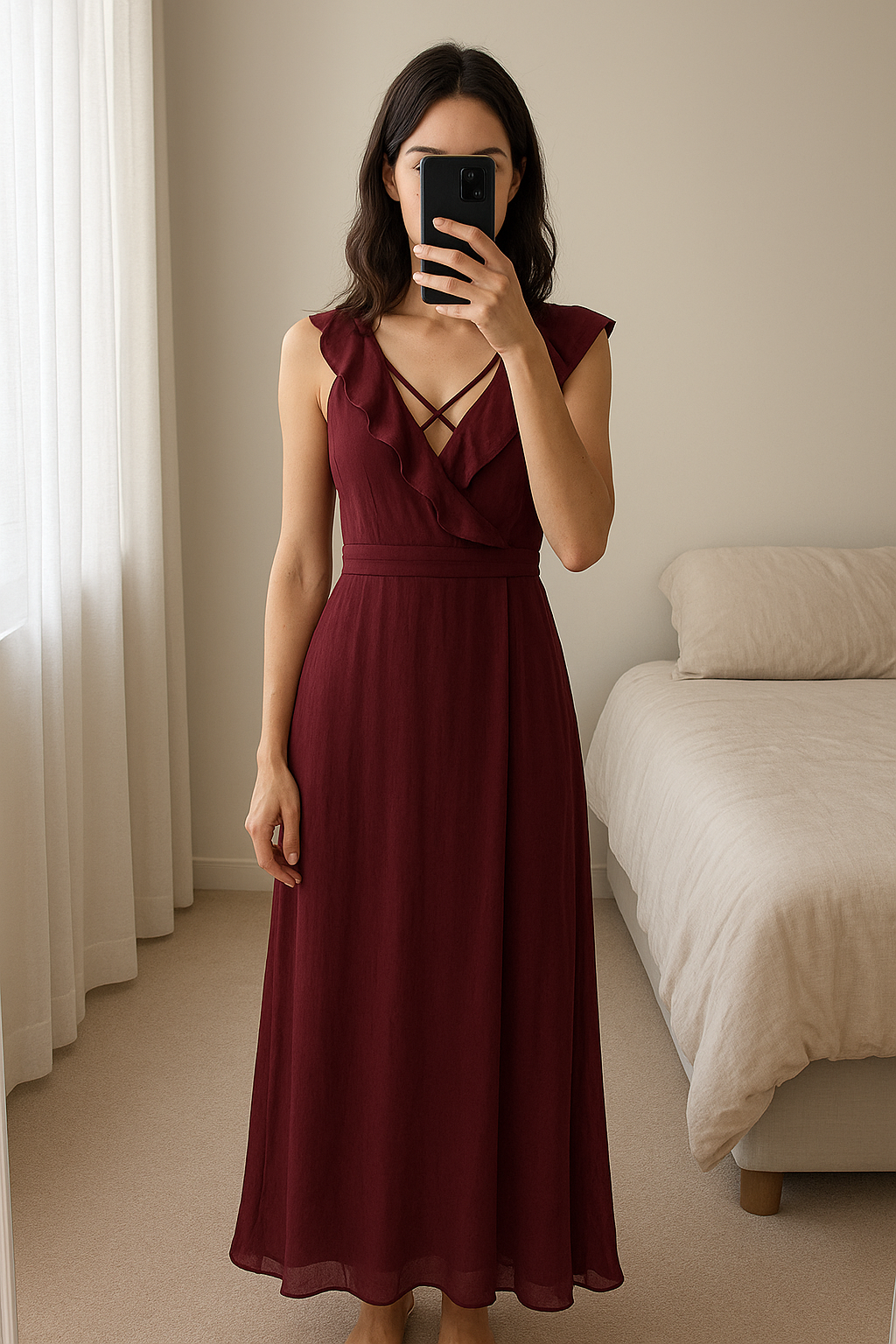 Wine long River Island dress standing straight facing the camera, in a softly lit bedroom setting, with gentle natural light filtering through a window.