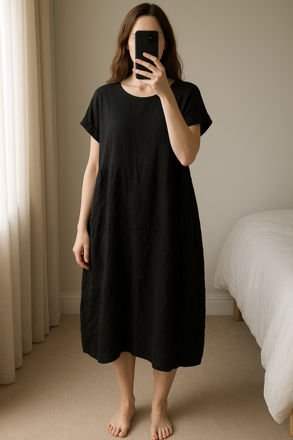 Women’s Black Dress standing straight facing the camera, in a softly lit bedroom setting, with gentle natural light filtering through a window.
