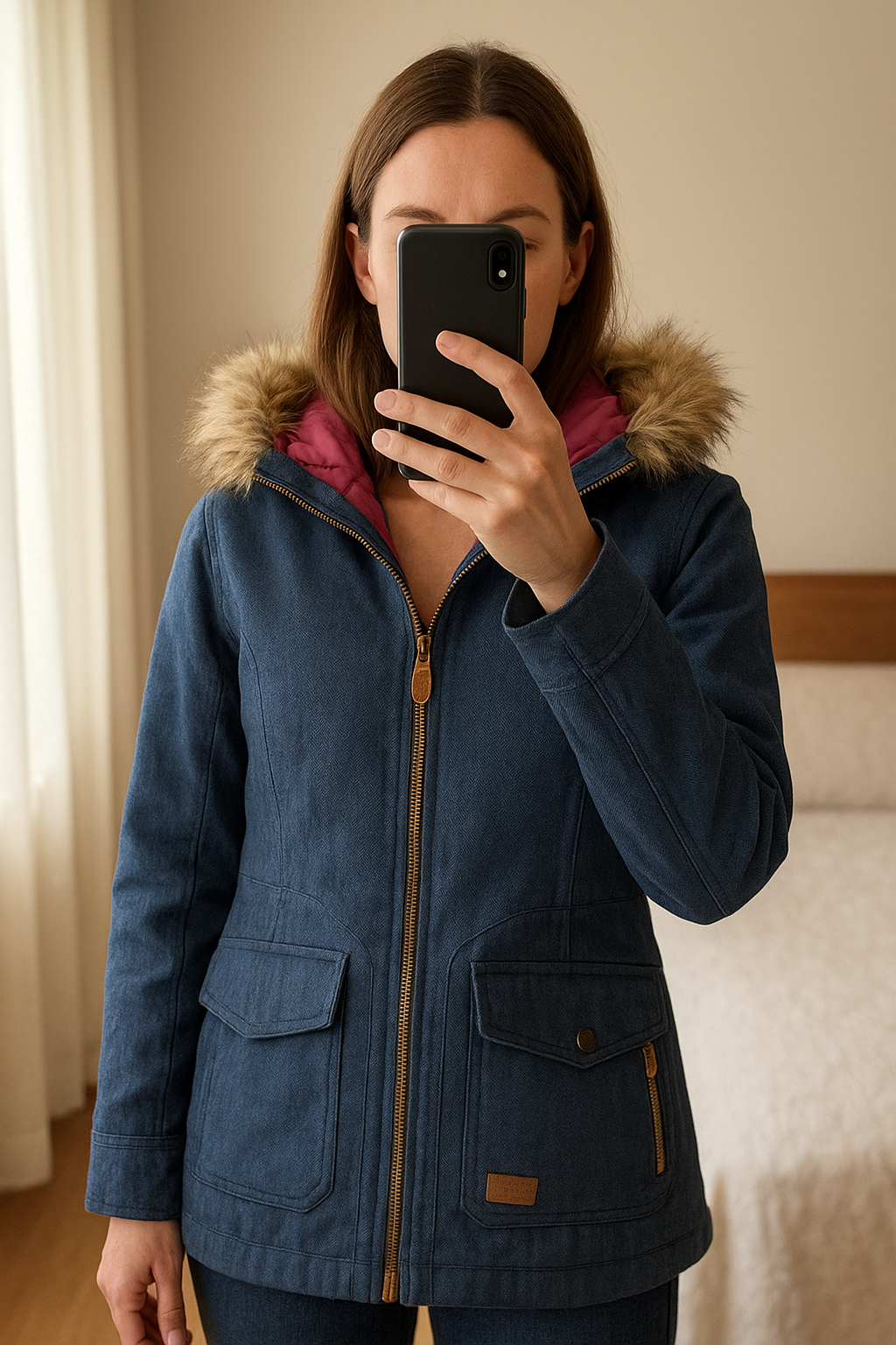 Women's Blue/Denim Trespass Jacket - fits 8-10 standing straight facing the camera, in a softly lit bedroom setting, with gentle natural light filtering through a window.