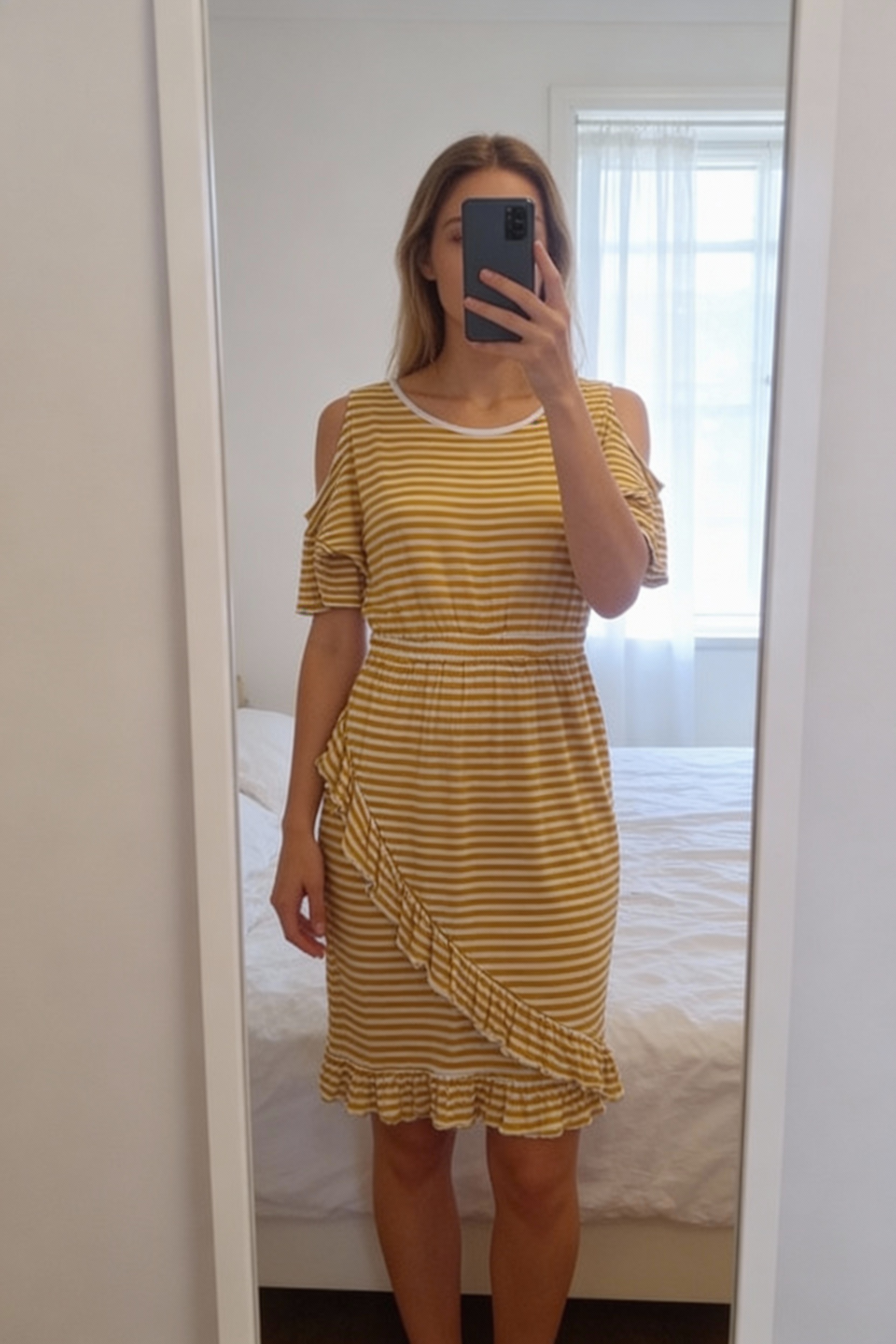 Women’s dress from Europe No Man's Label standing straight facing the camera, in a softly lit bedroom setting, with gentle natural light filtering through a window.