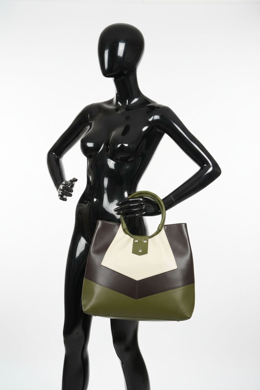 a glossy black plastic mannequin with no facial features in Women’s Furla retro style shopper arching their back slightly for a dynamic pose, in a clean photo studio with seamless white backdrop and softbox lighting.