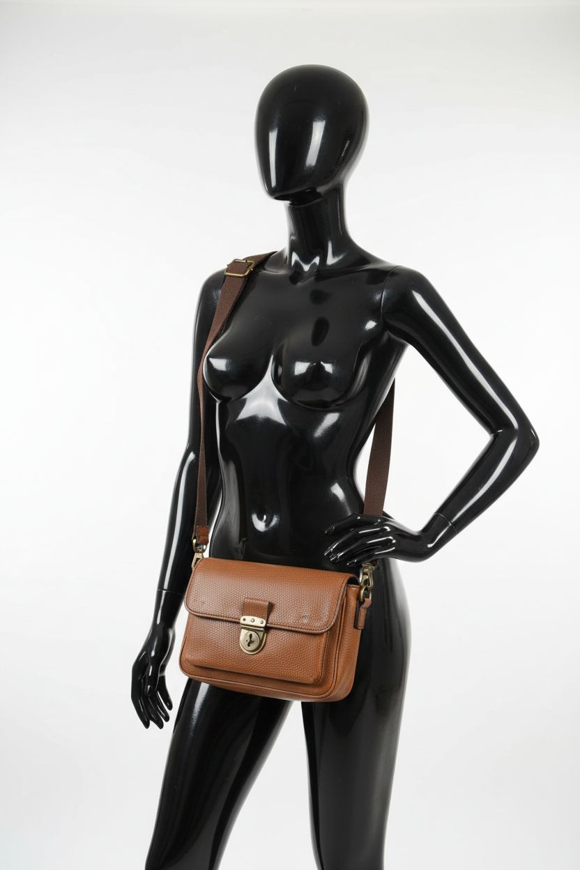 a glossy black plastic mannequin with no facial features in Women’s M&S Tan Leather Crossbody arching their back slightly for a dynamic pose, in a clean photo studio with seamless white backdrop and softbox lighting.