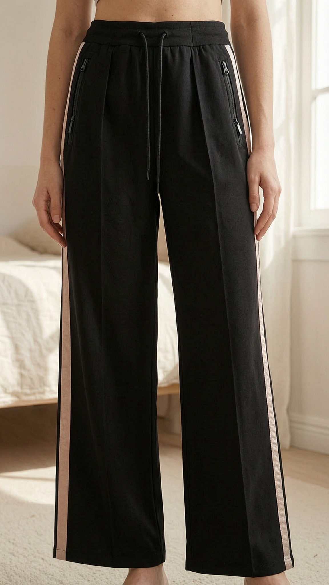 Women’s M&S trousers standing straight facing the camera, in a softly lit bedroom setting, with gentle natural light filtering through a window.
