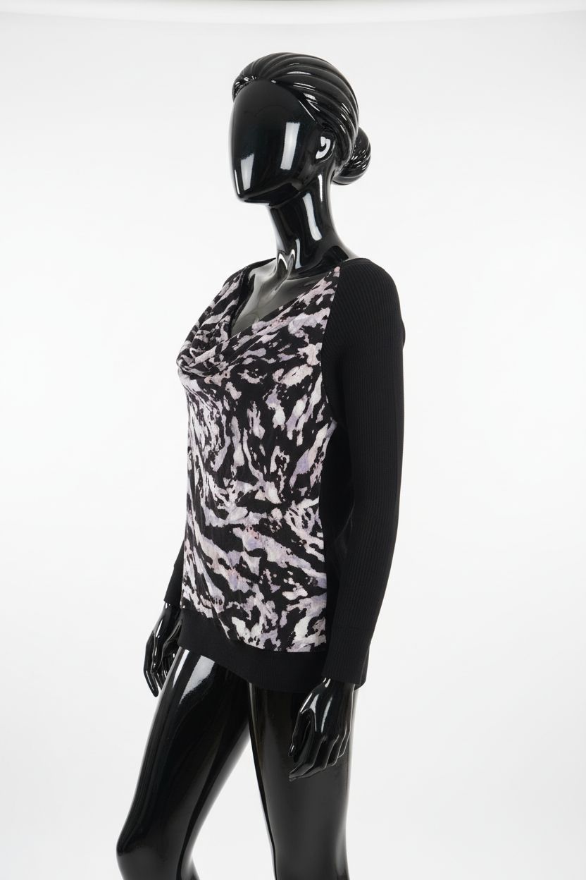 a glossy black plastic mannequin with no facial features in Women’s Mint Velvet Black top with pattern back Size Large arching their back slightly for a dynamic pose, in a clean photo studio with seamless white backdrop and softbox lighting.