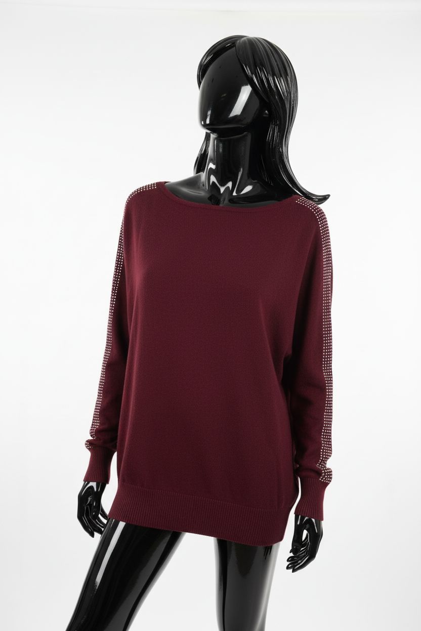 a glossy black plastic mannequin with no facial features in Women’s Mint Velvet Diamonte Sleeve Burgundy Jumper Size Large arching their back slightly for a dynamic pose, in a clean photo studio with seamless white backdrop and softbox lighting.