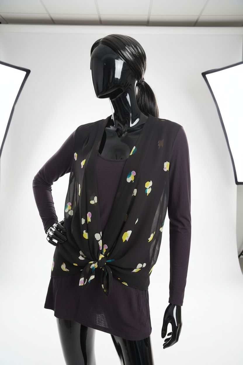 a glossy black plastic mannequin with no facial features in Women’s Mint Velvet Size 16 Black Jumper With Overlay Front Tie Blouse arching their back slightly for a dynamic pose, in a clean photo studio with seamless white backdrop and softbox lighting.