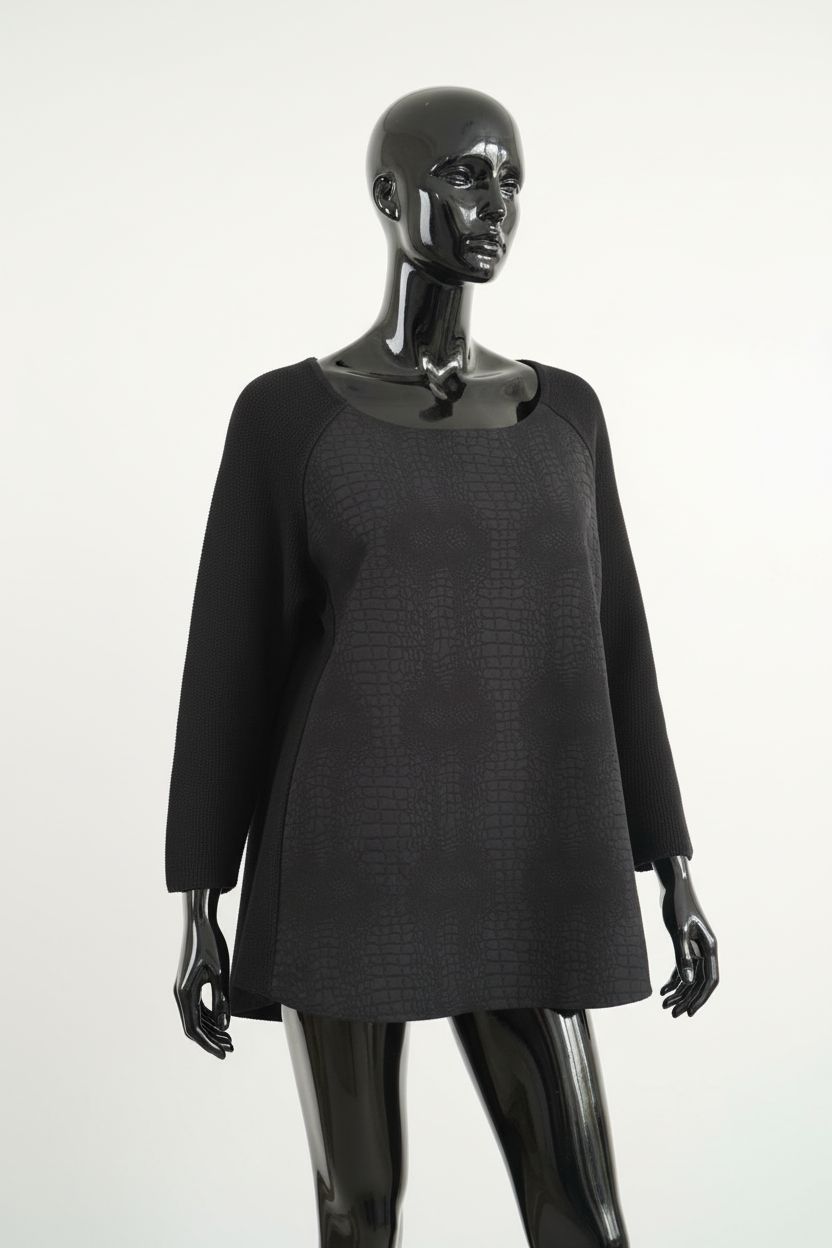 a glossy black plastic mannequin with no facial features in Women’s Mint Velvet Size 18 Black Snake Jumper arching their back slightly for a dynamic pose, in a clean photo studio with seamless white backdrop and softbox lighting.