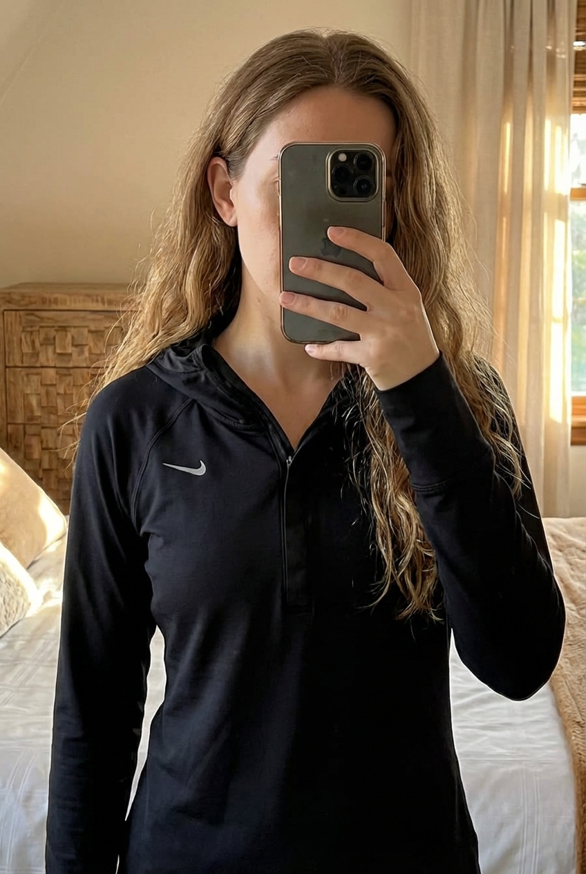 Women’s Nike Wool Blend Dri-FIT Black Hooded Running Top – Size XS standing straight facing the camera, in a softly lit bedroom setting, with gentle natural light filtering through a window.