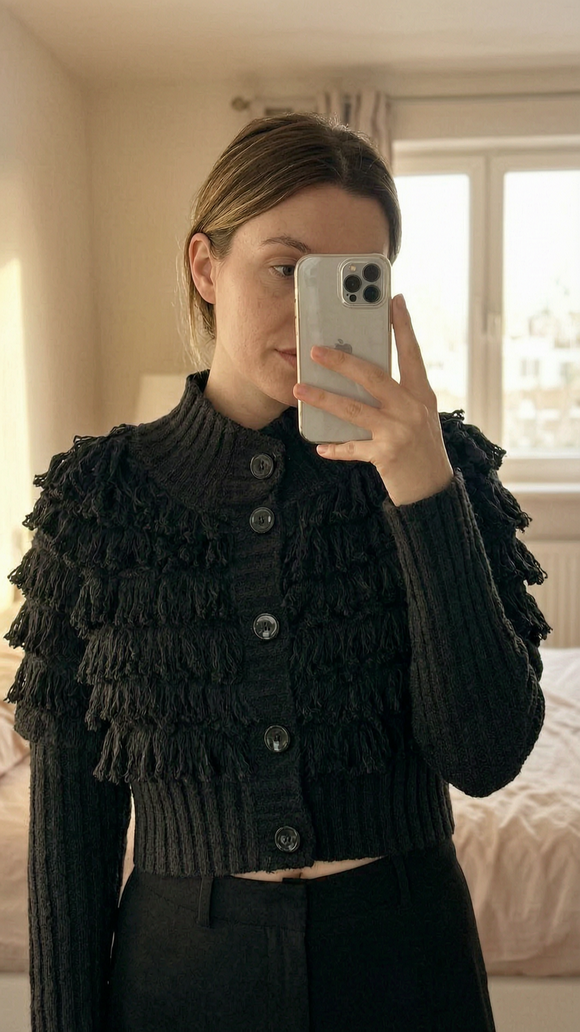 Women’s Qed London cardigan standing straight facing the camera, in a softly lit bedroom setting, with gentle natural light filtering through a window.