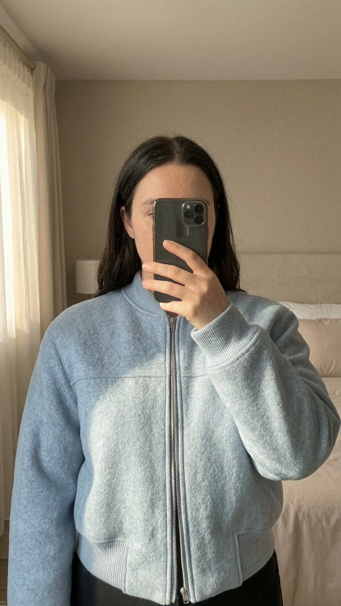 Women’s Zara Light Blue Cropped Zip-Up Bomber Jacket Size Small standing straight facing the camera, in a softly lit bedroom setting, with gentle natural light filtering through a window.