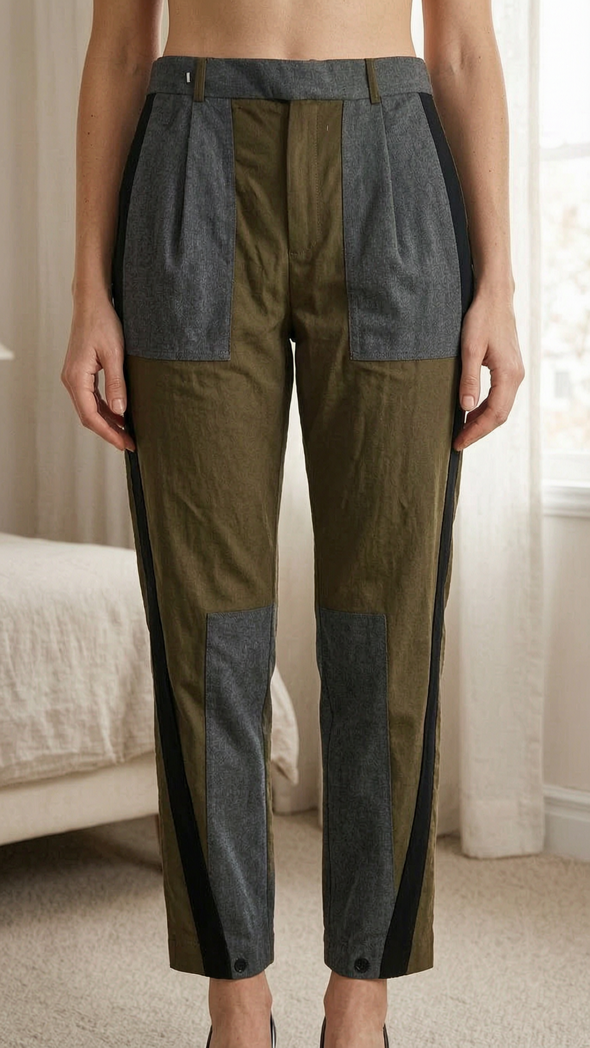 Women’s Zara SRPLS Grey, Khaki, Black Trousers Size M (12) standing straight facing the camera, in a softly lit bedroom setting, with gentle natural light filtering through a window.