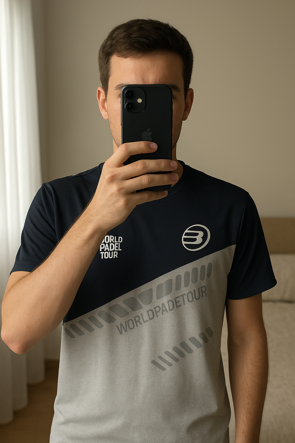 World Tour Padel shirt {NEW no tag} Sports Padel sporting Soccer Padelling standing straight facing the camera, in a softly lit bedroom setting, with gentle natural light filtering through a window.