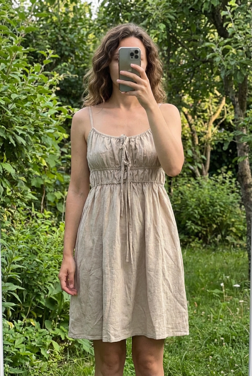 Eine Person in Wunderschönes Kleid zum Schnüren | Gr. S aufrecht stehend, der Kamera zugewandt, mit schlanker Figur, im Freien, in einer natürlichen Umgebung, umgeben von Grün und sanftem Tageslicht.
