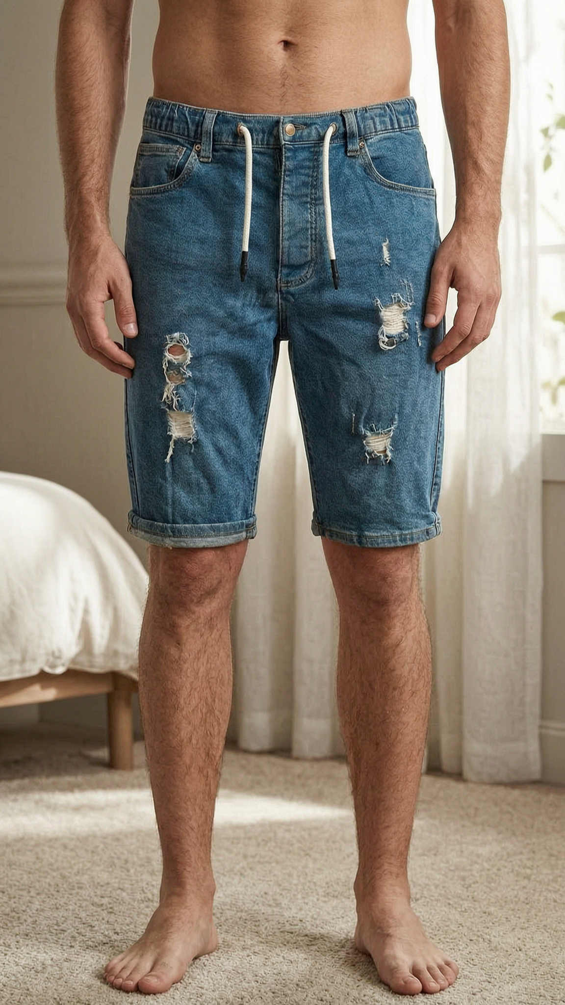 A person in XS Men’s slim stretch ripped frayed denim summer shorts standing straight facing the camera, in a softly lit bedroom setting, with gentle natural light filtering through a window.