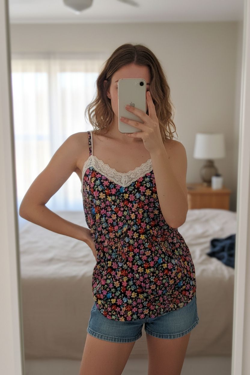 A person in y2k Atmosphere long Black Floral Cami Top UK 12 Summer arching their back slightly for a dynamic pose, with a slim body type, in a softly lit bedroom setting, with gentle natural light filtering through a window.