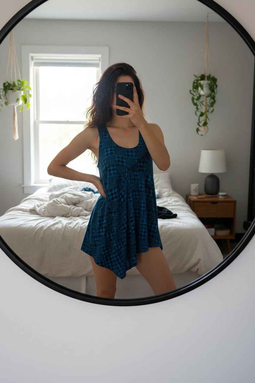 A person in Y2K Blue & Black Houndstooth Asymmetric Dress Next UK 14 Indie Alt arching their back slightly for a dynamic pose, with a slim body type, in a softly lit bedroom setting, with gentle natural light filtering through a window.