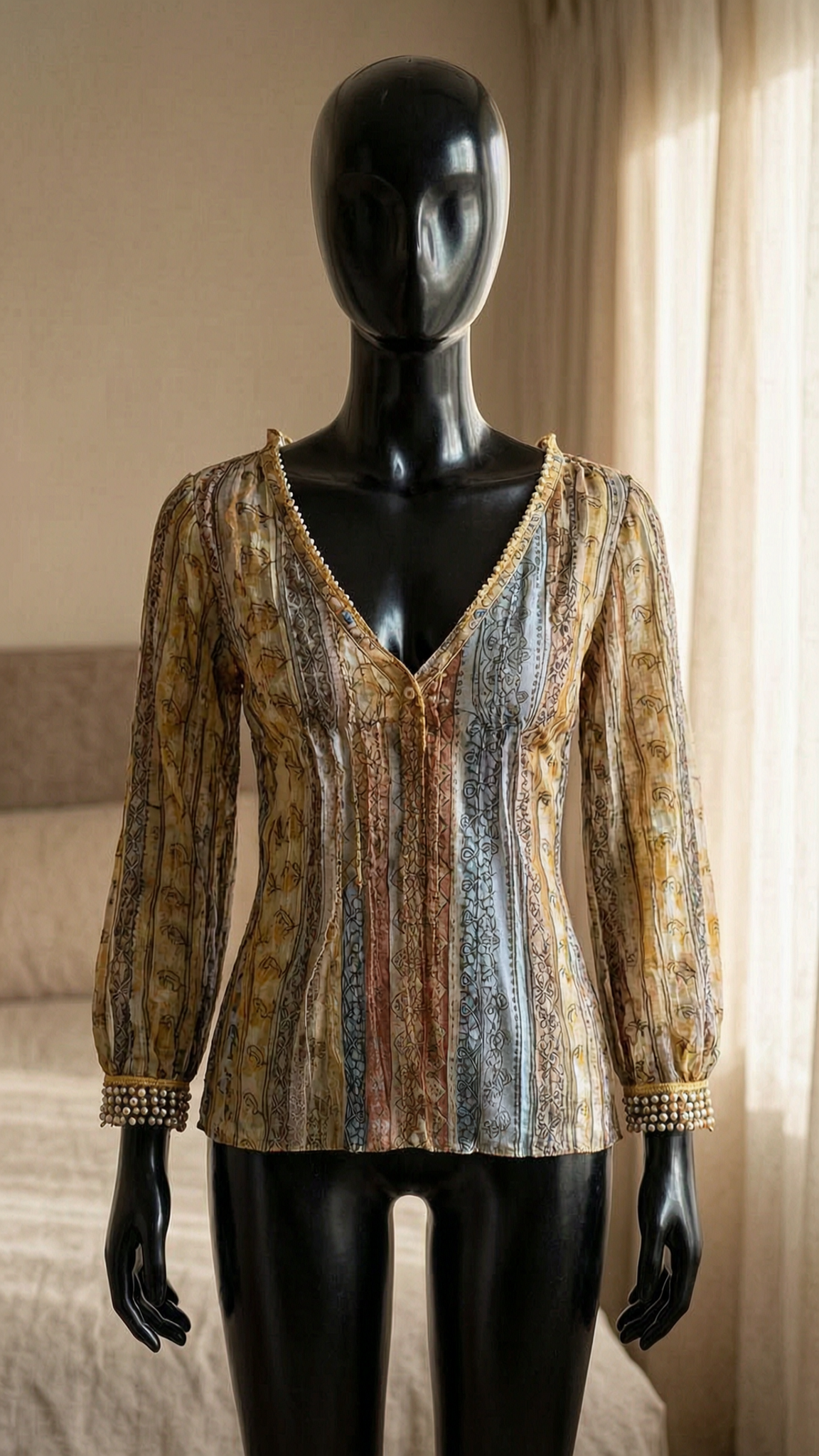 a glossy black plastic mannequin with no facial features in Y2K Jaipur Boho Printed Crinkle Top with Beaded Trim Size L standing straight facing the camera, in a softly lit bedroom setting, with gentle natural light filtering through a window.