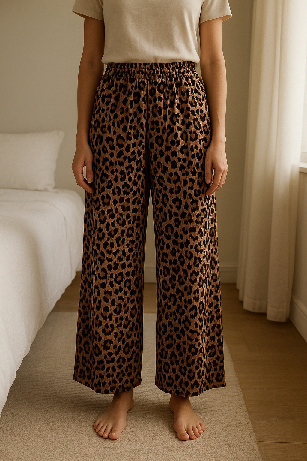 Yours wide leg crinkle trousers in leopard print size 28 standing straight facing the camera, in a softly lit bedroom setting, with gentle natural light filtering through a window.