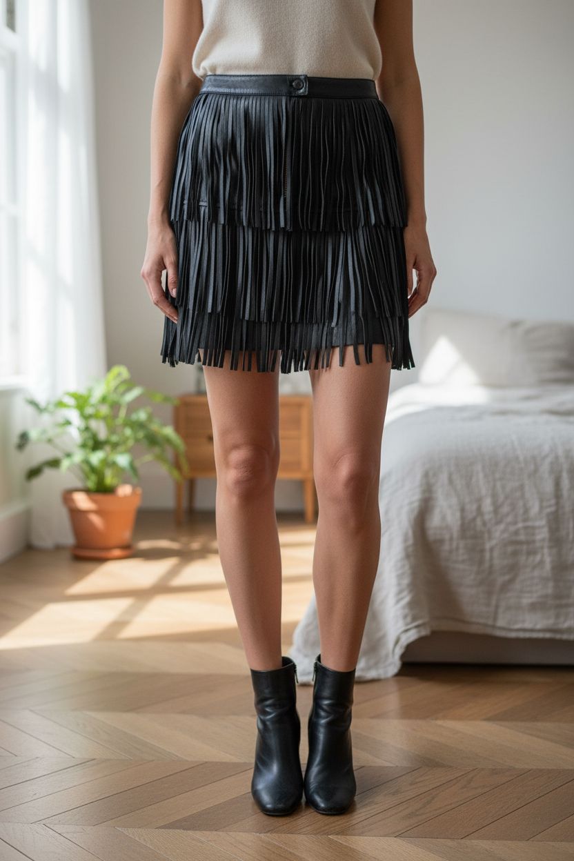 Zadig and Voltaire ‘Jaliz’ Deluxe Real Leather Tassel Fringed Mini Skirt Black 34 UK 6 standing straight facing the camera, in a softly lit bedroom setting, with gentle natural light filtering through a window.