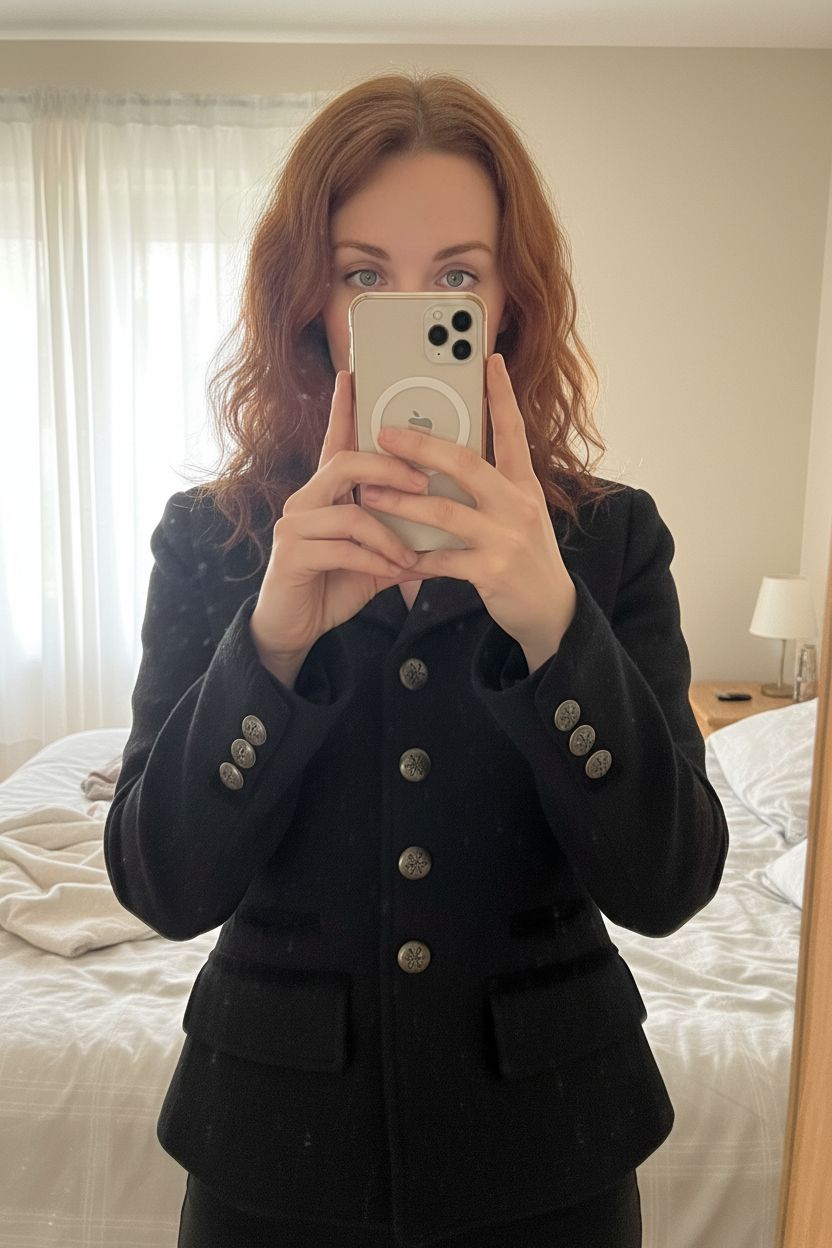 Zara Black 100% Wool Tailored Coat Military Style Size M standing straight facing the camera, in a softly lit bedroom setting, with gentle natural light filtering through a window.