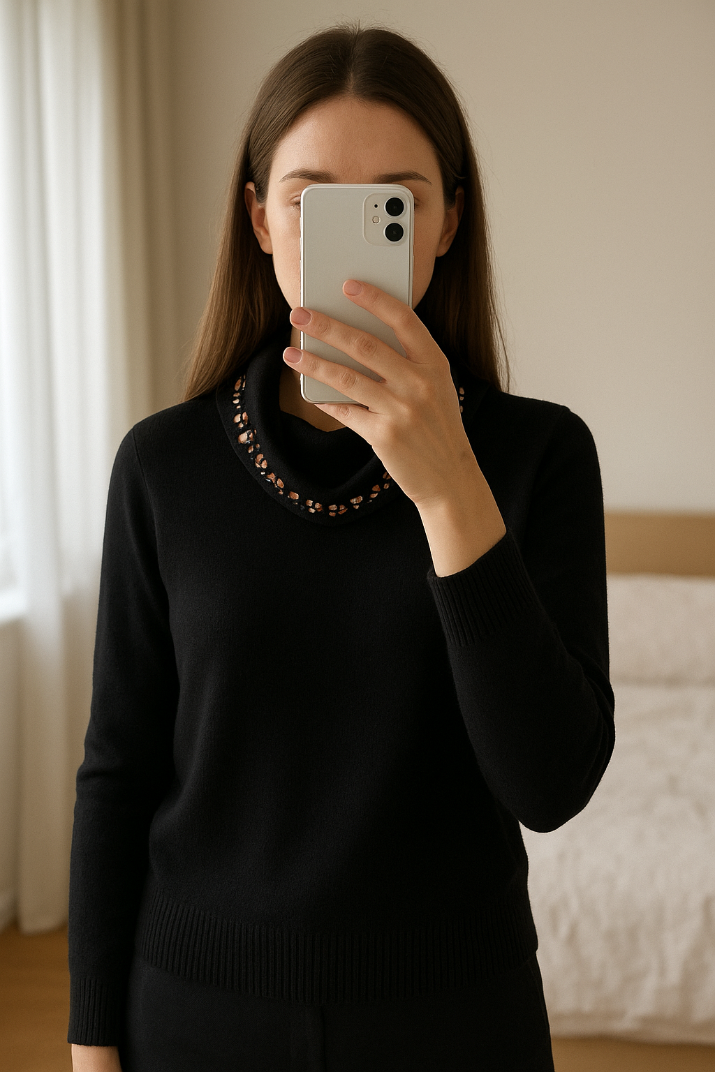Zara Black Embellished Knit Top standing straight facing the camera, in a softly lit bedroom setting, with gentle natural light filtering through a window.