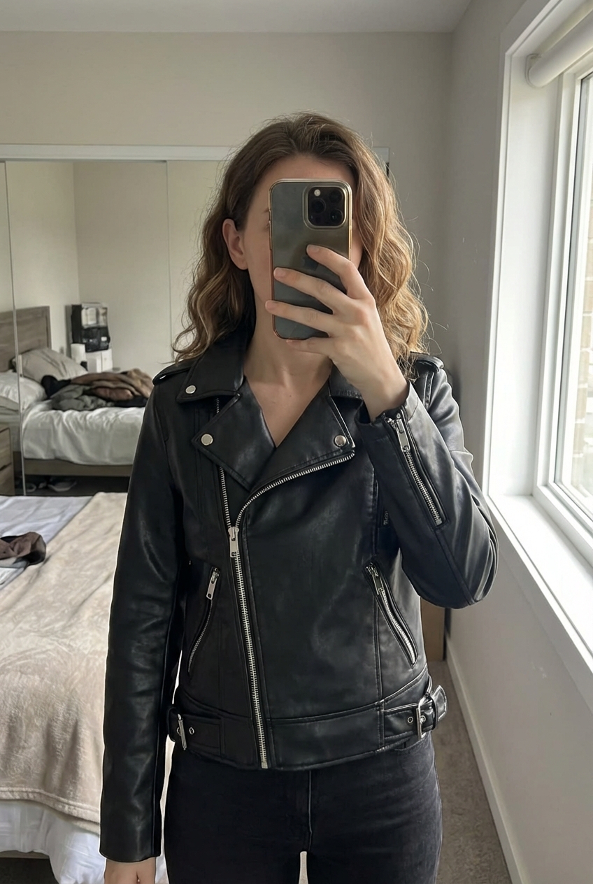 Zara Black Faux Leather Biker Jacket Zip Detail Cropped Fit Size XS standing straight facing the camera, in a softly lit bedroom setting, with gentle natural light filtering through a window.