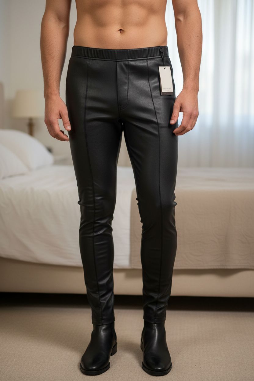 ZARA Black Faux Leather Leggings Size XS New With Tags standing straight facing the camera, in a softly lit bedroom setting, with gentle natural light filtering through a window.