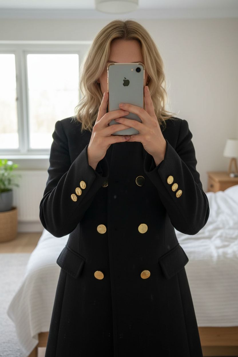 Zara Black Military Style Wool Jacket UK 10/12 standing straight facing the camera, in a softly lit bedroom setting, with gentle natural light filtering through a window.