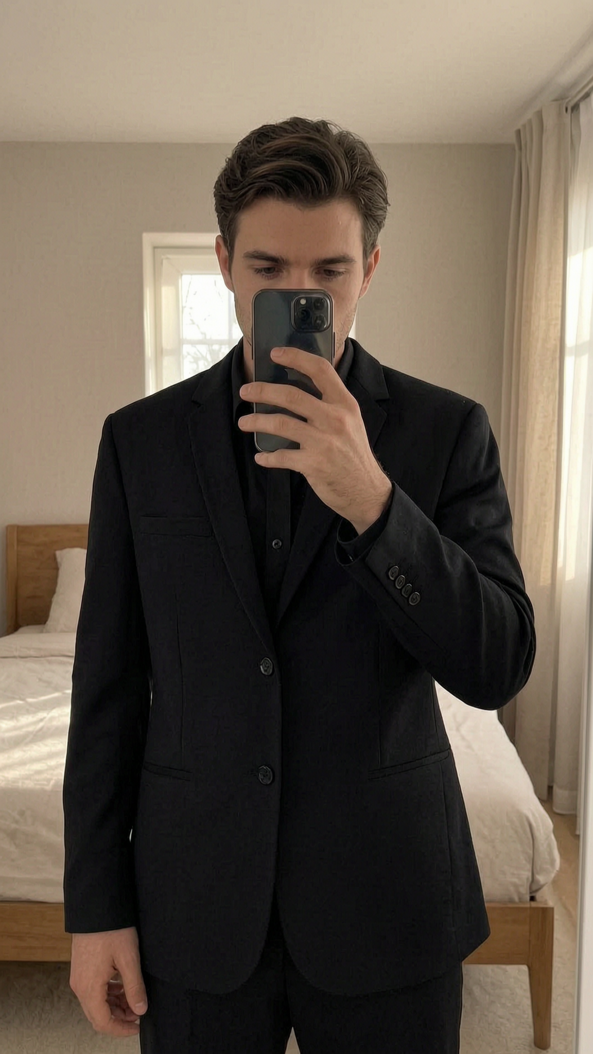 ZARA Black Tailored Blazer XL standing straight facing the camera, in a softly lit bedroom setting, with gentle natural light filtering through a window.