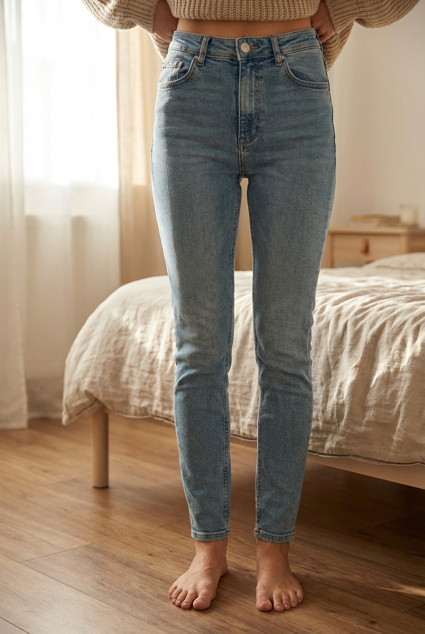 Zara farmernadrág standing straight facing the camera, in a softly lit bedroom setting, with gentle natural light filtering through a window.